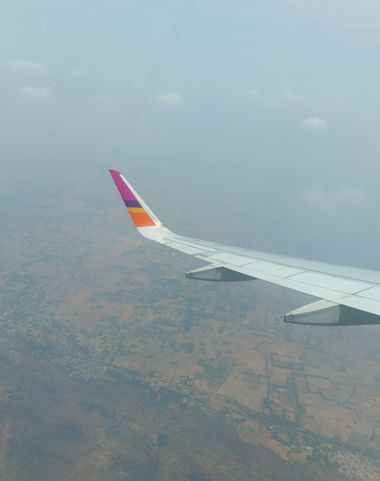Alternative Text: Thai Smile Airways colors on an airplane’s wings flying in the sky. The land and the sky are visible in the background.
