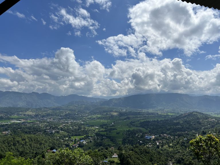 Alternative Text: A wide shot of a valley with green fields and a town, surrounded by mountains under a bright, cloudy, blue sky.