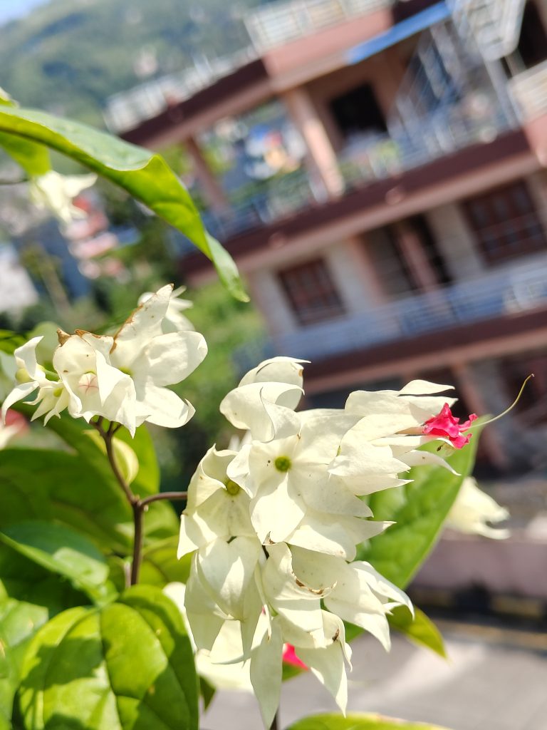 Alternative Text: A close-up of white flowers with unique petal shapes, featuring a small pink flower amongst the green leaves.