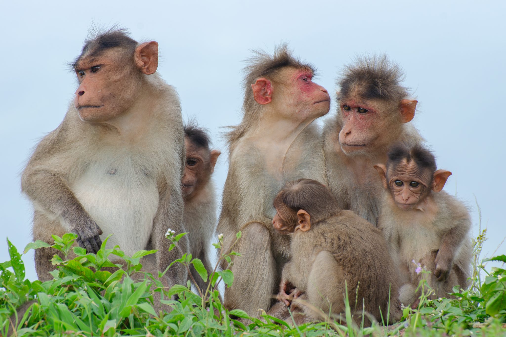 Alternative Text: Six monkeys of different ages sit together in a lush green setting, gazing in various directions with curious, contemplative expressions.