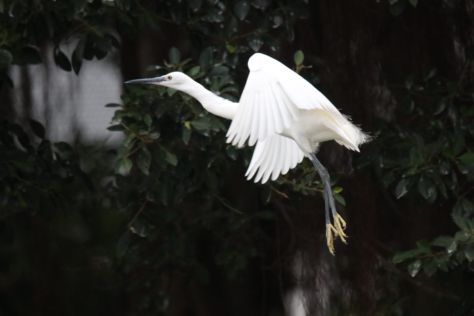 Alternative Text: A little egret flying with its wings open against a dark leafy background.