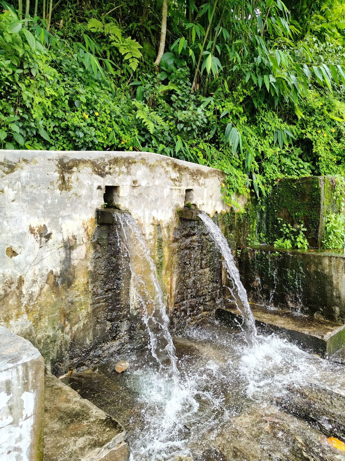 Alternative Text: A scenic view of a stone water fountain, with clear water flowing from two openings at the top, splashing into a shallow basin below. Surrounding the fountain is lush greenery, including vibrant leaves and small plants, creating a serene natural atmosphere.