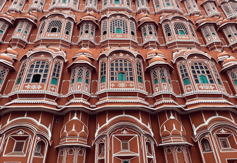 Alternative Text: A close-up of the Hawa Mahal in Jaipur, India, showing its intricate latticework and ornate windows.