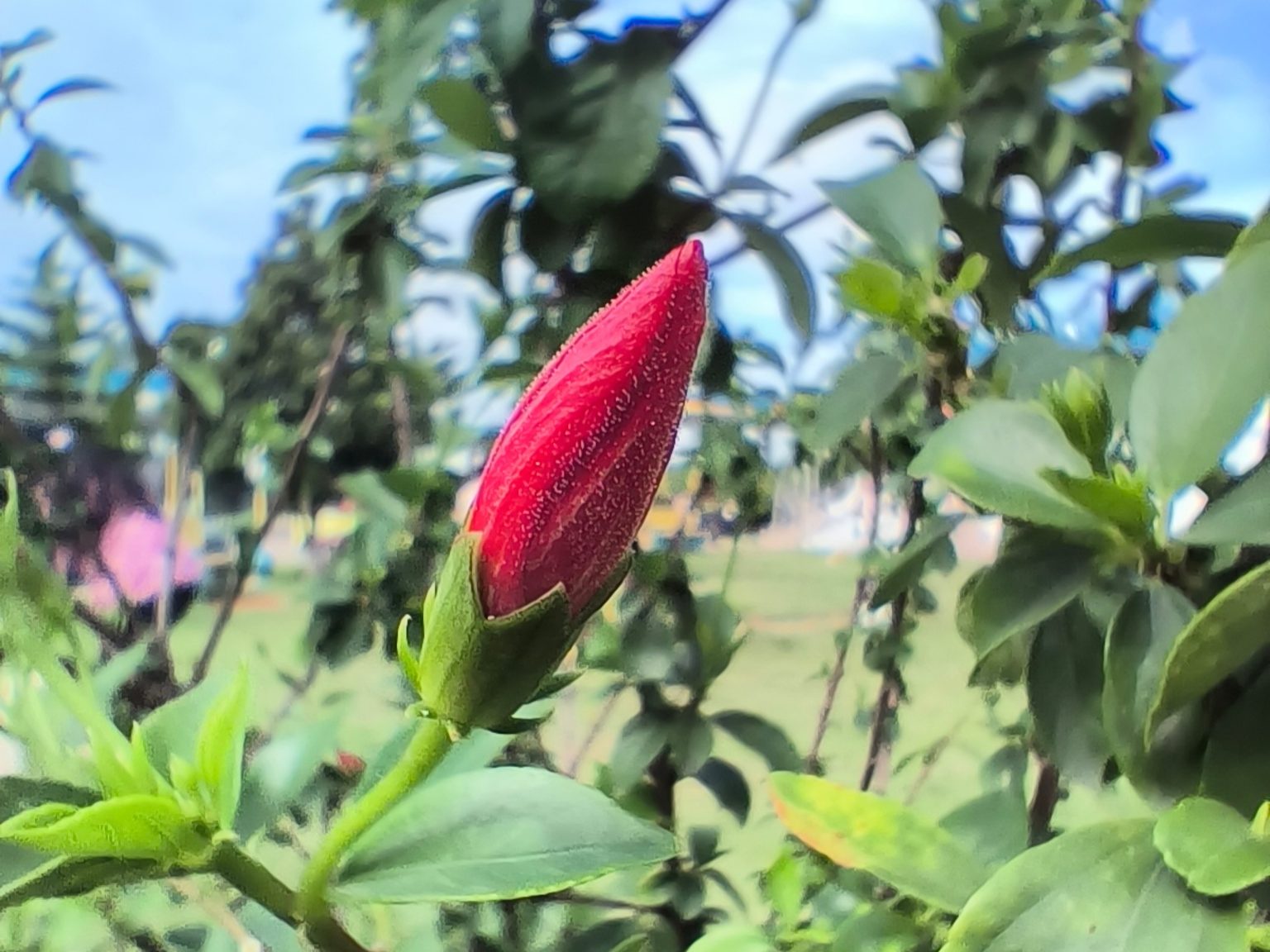 Alternative Text: Close-up of a red hibiscus bud among green leaves, with a soft blurred background of trees and a clear sky.