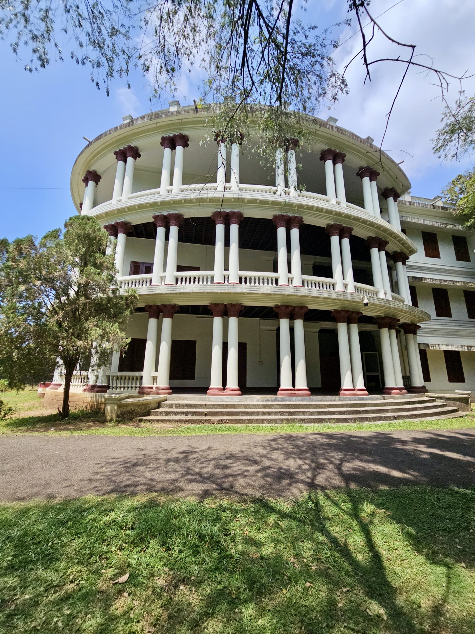 Alternative Text: A large colonial building with tall white pillars and a rounded facade, set under a bright blue sky, captured at Hill Palace, Thrippunithura, Kerala.