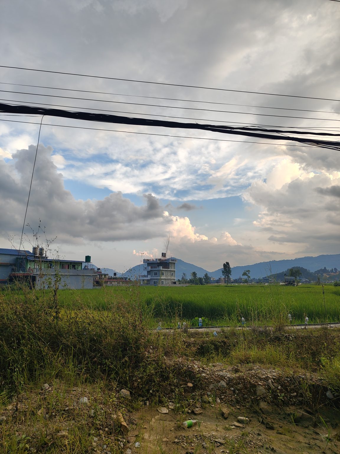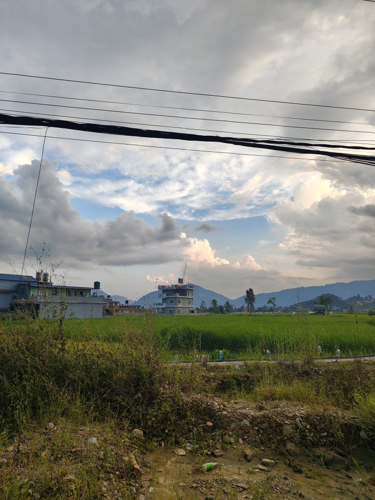 Alternative Text: A scenic view of a rural landscape featuring a green field of rice, with a backdrop of mountains under a partly cloudy sky.