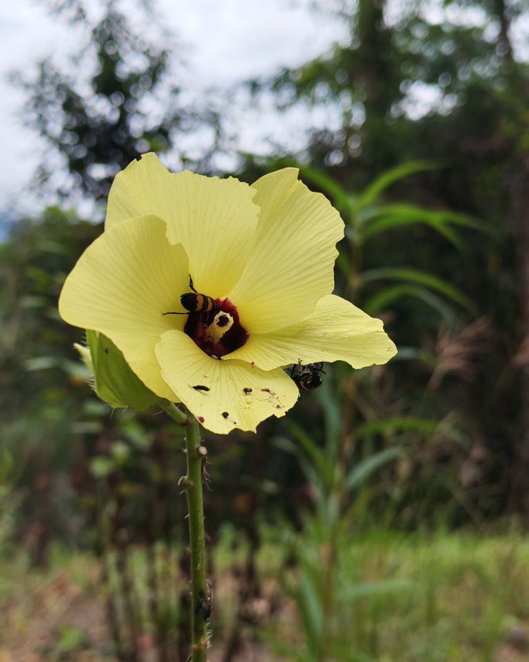 Alternative Text: A large, yellow flower with a red center, surrounded by green foliage