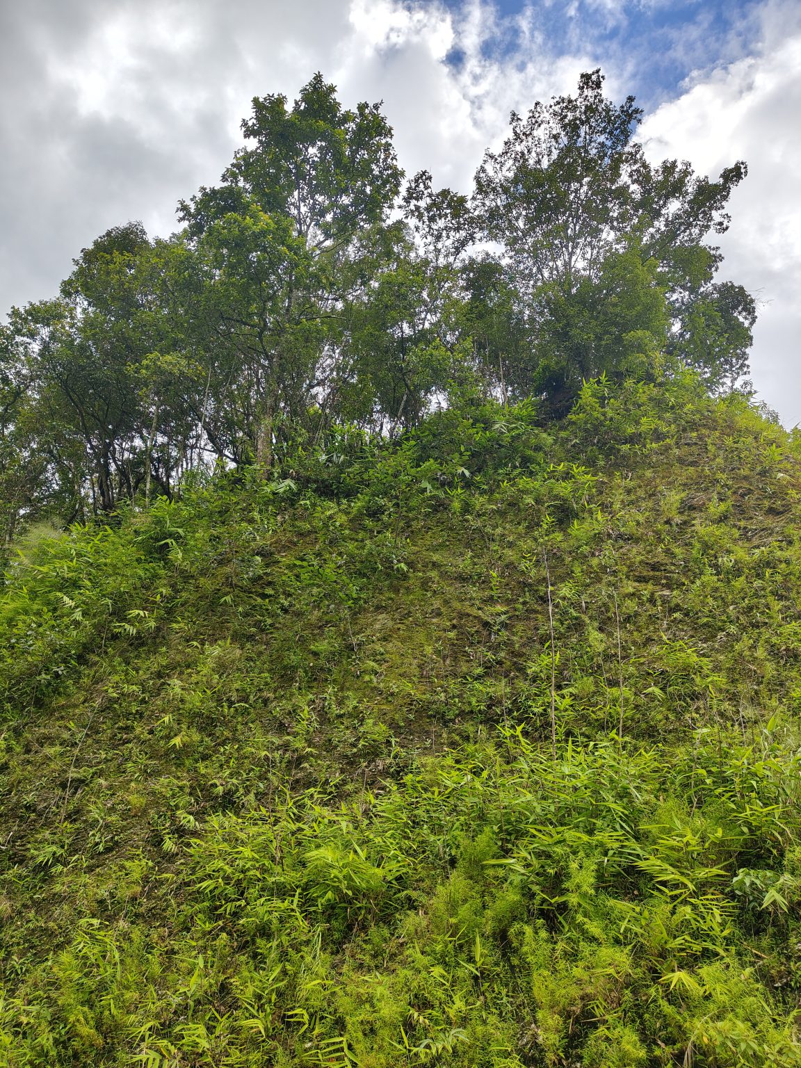 Alternative Text: A lush green hillside under a partly cloudy sky, featuring a dense cluster of trees at the top and various types of vegetation including ferns and grasses in the foreground.