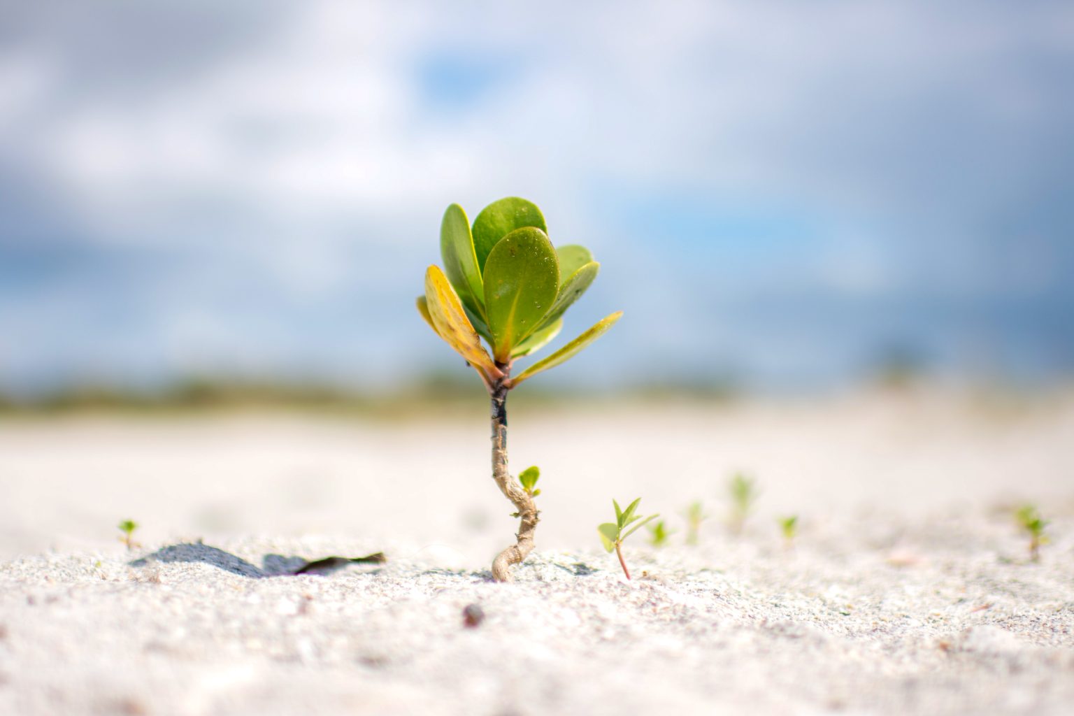 Alternative Text: Lone sea grape plant sprouting out of a sandy beach
