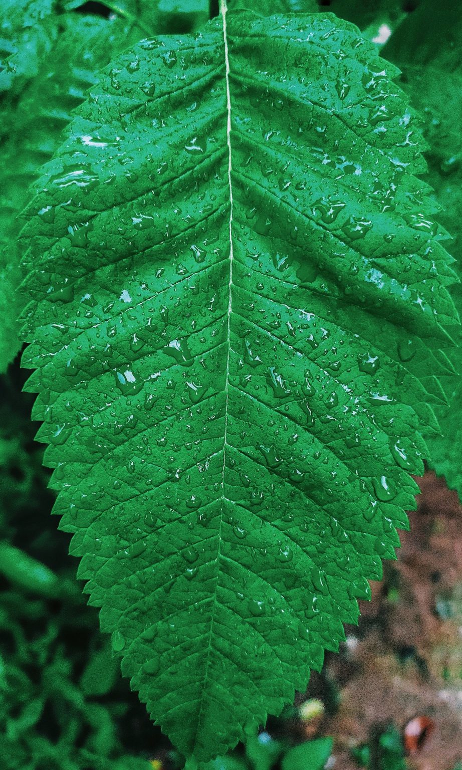 Alternative Text: A leaf, up close, covered in shiny water droplets, reflecting light and showcasing nature’s beauty.