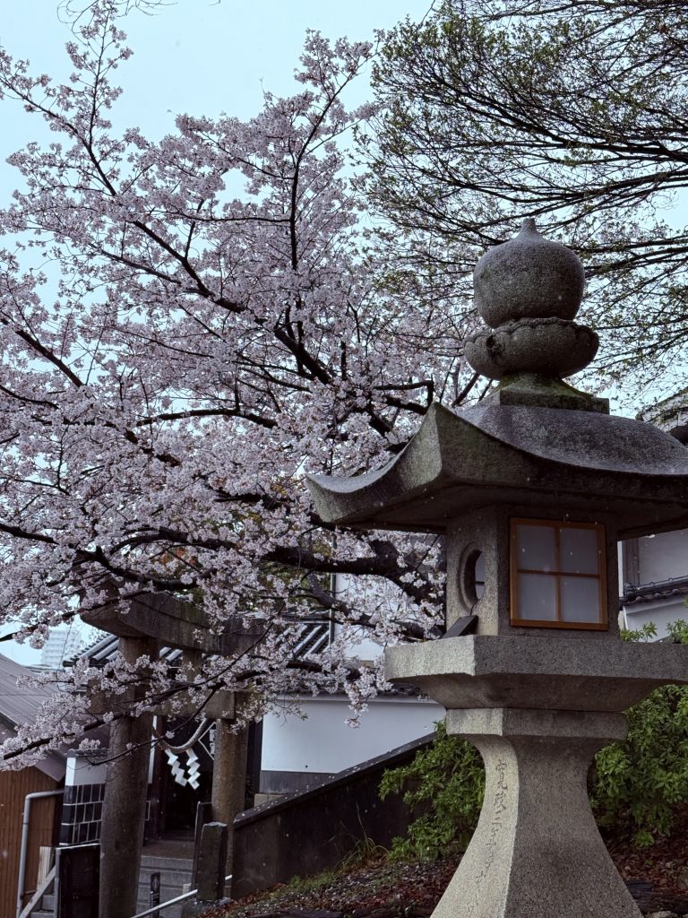 Alternative Text: Cherry blossoms and stone lanterns at the entrance of Achi Shrine, Kurashiki.