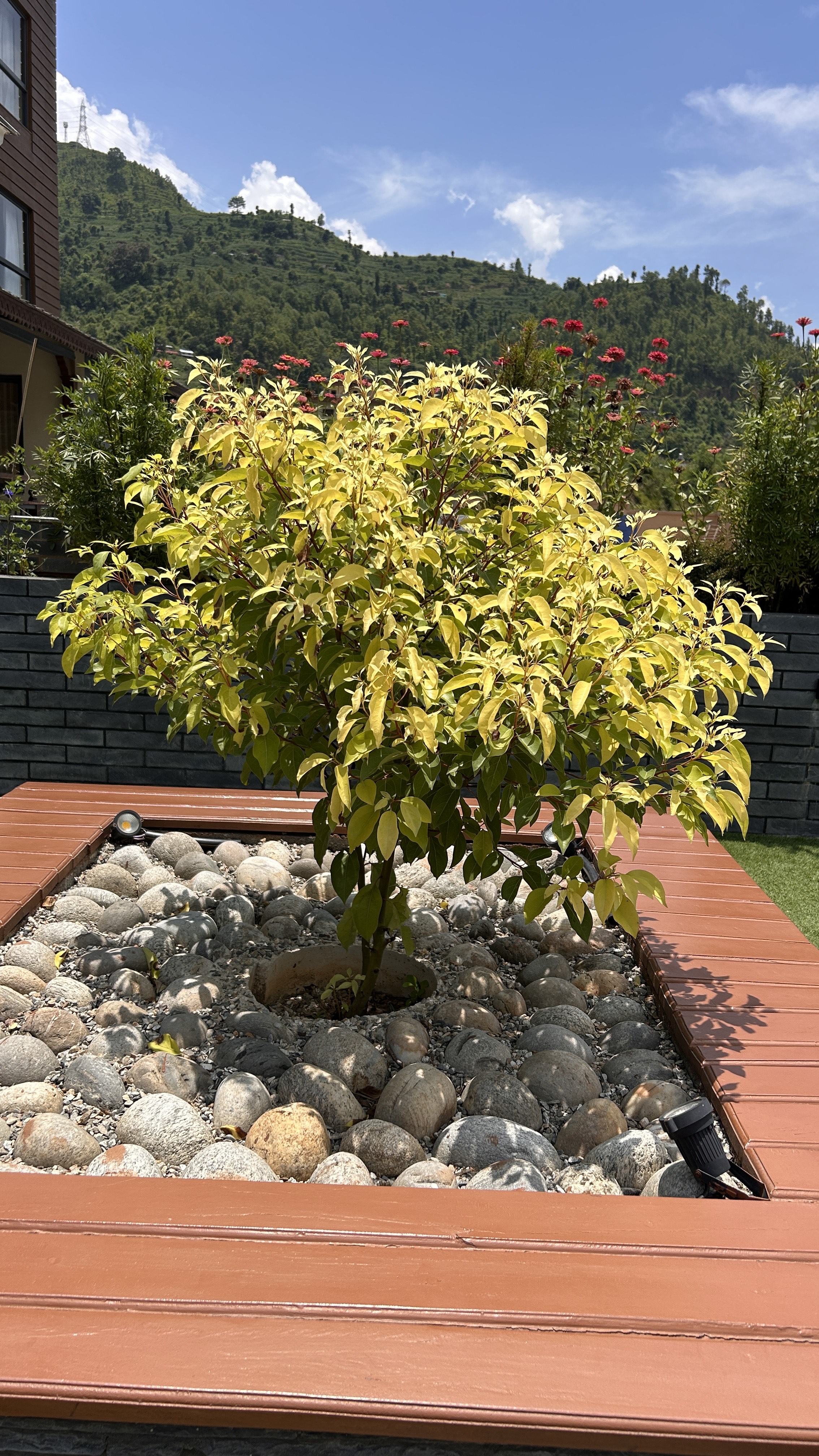 Alternative Text: A small, vibrant yellow-leafed tree is centered amid a bed of smooth pebbles, surrounded by a wooden border.
