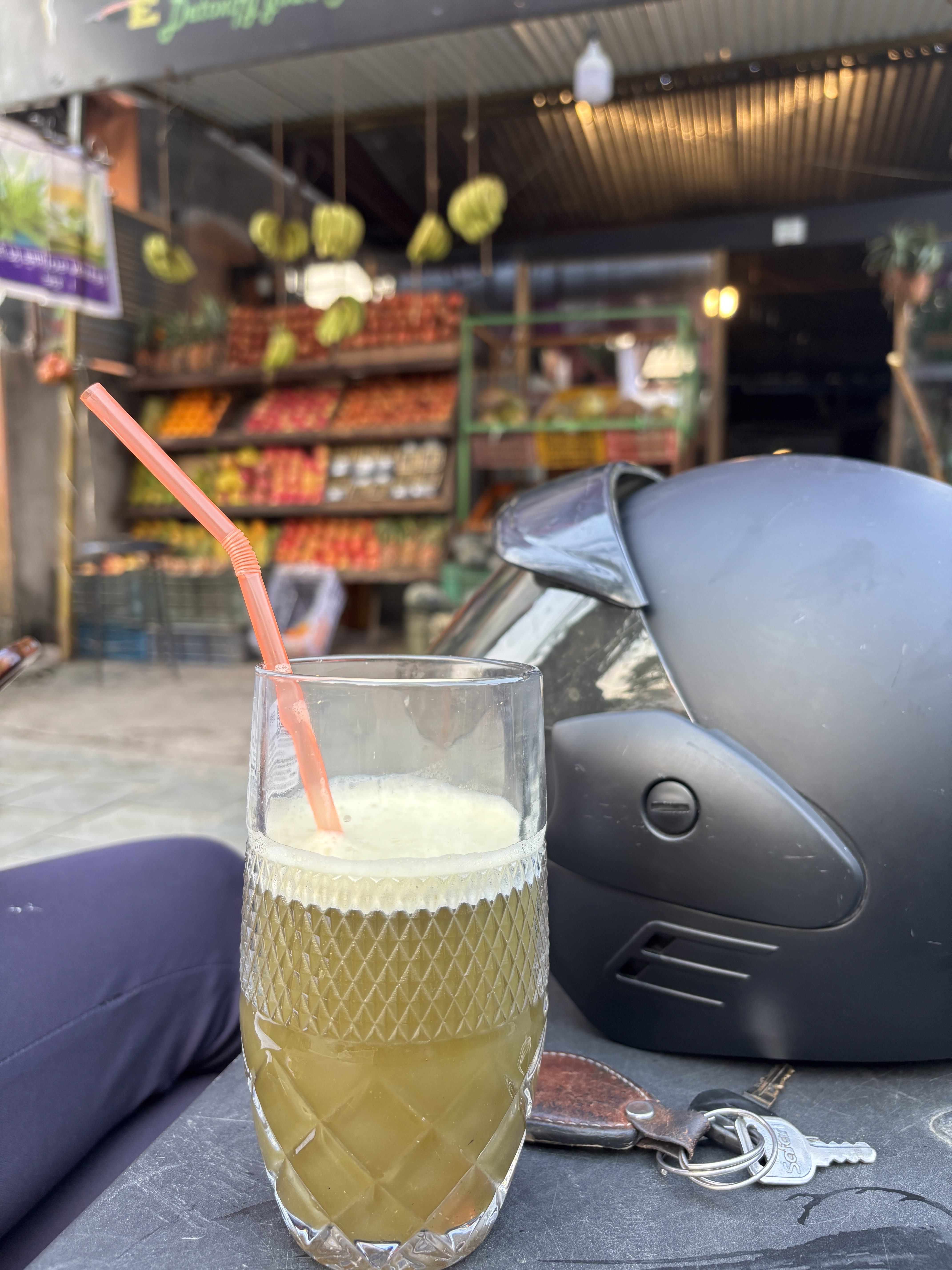 Alternative Text: A glass of green juice with a straw sits on a table, partially obscured by a black helmet and a set of keys.