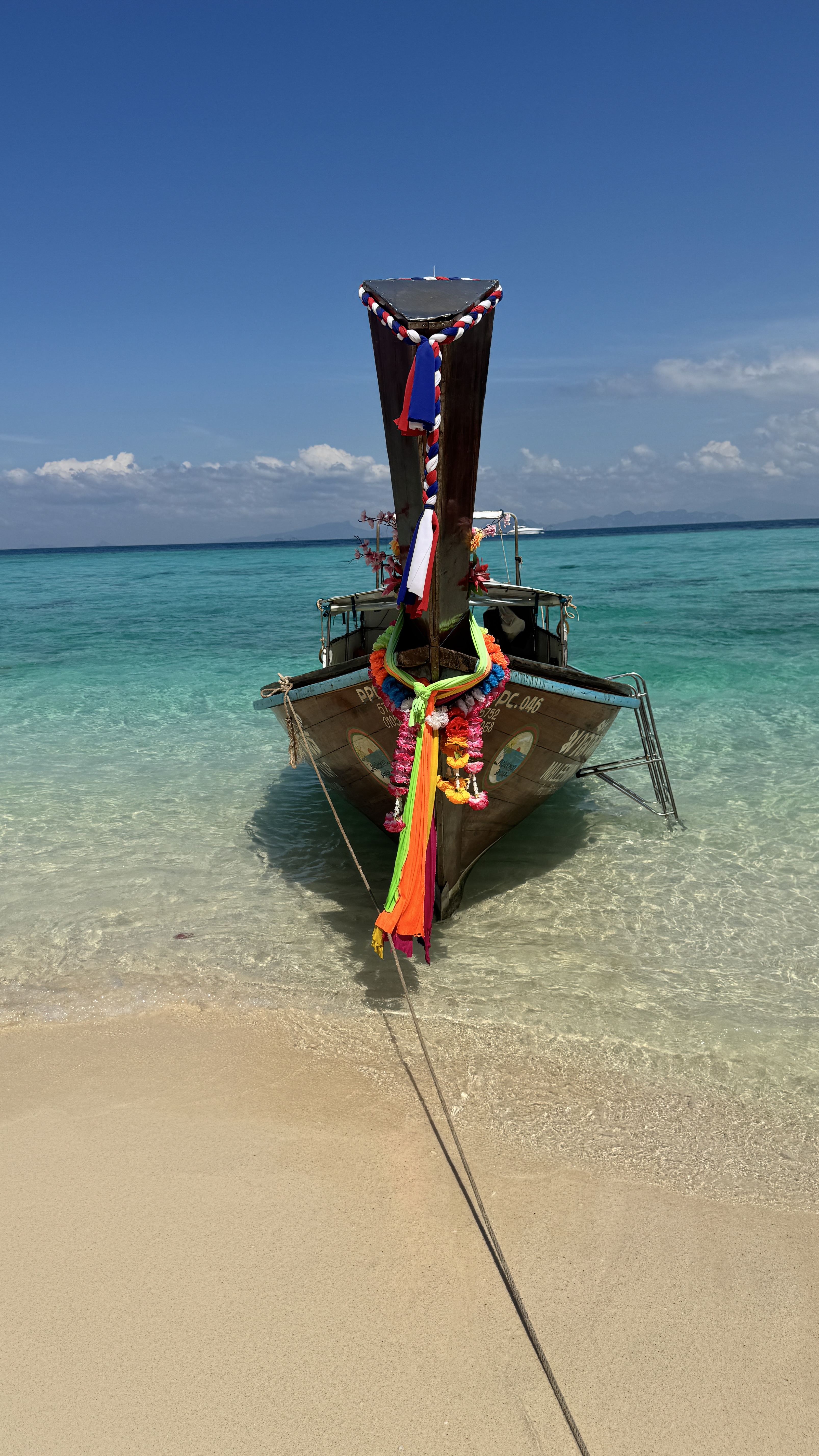 Alternative Text: A wooden longtail boat sits in clear turquoise water by a sandy beach. It has colorful garlands on the front, a rope tied to the shore, and the bright blue sky reflects in the water.