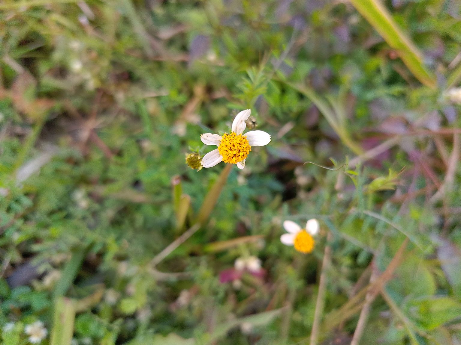 Alternative Text: A close-up photograph of a small flower with white petals and a vibrant yellow center, surrounded by green grass and foliage.