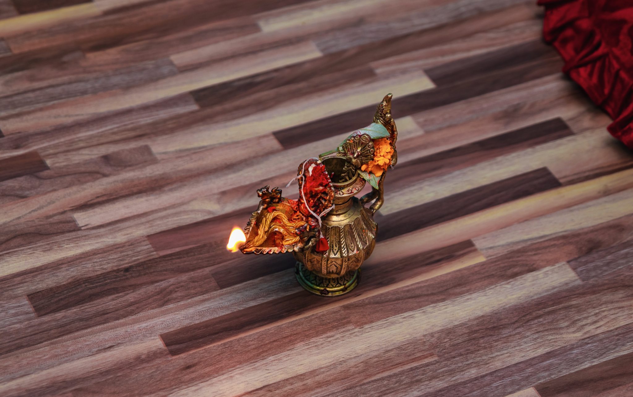 Alternative Text: A beautifully arranged brass lamp embellished with flowers