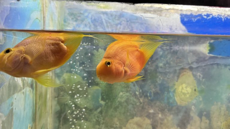 Alternative Text: Two brightly colored fish are swimming near the surface of a clear aquarium.