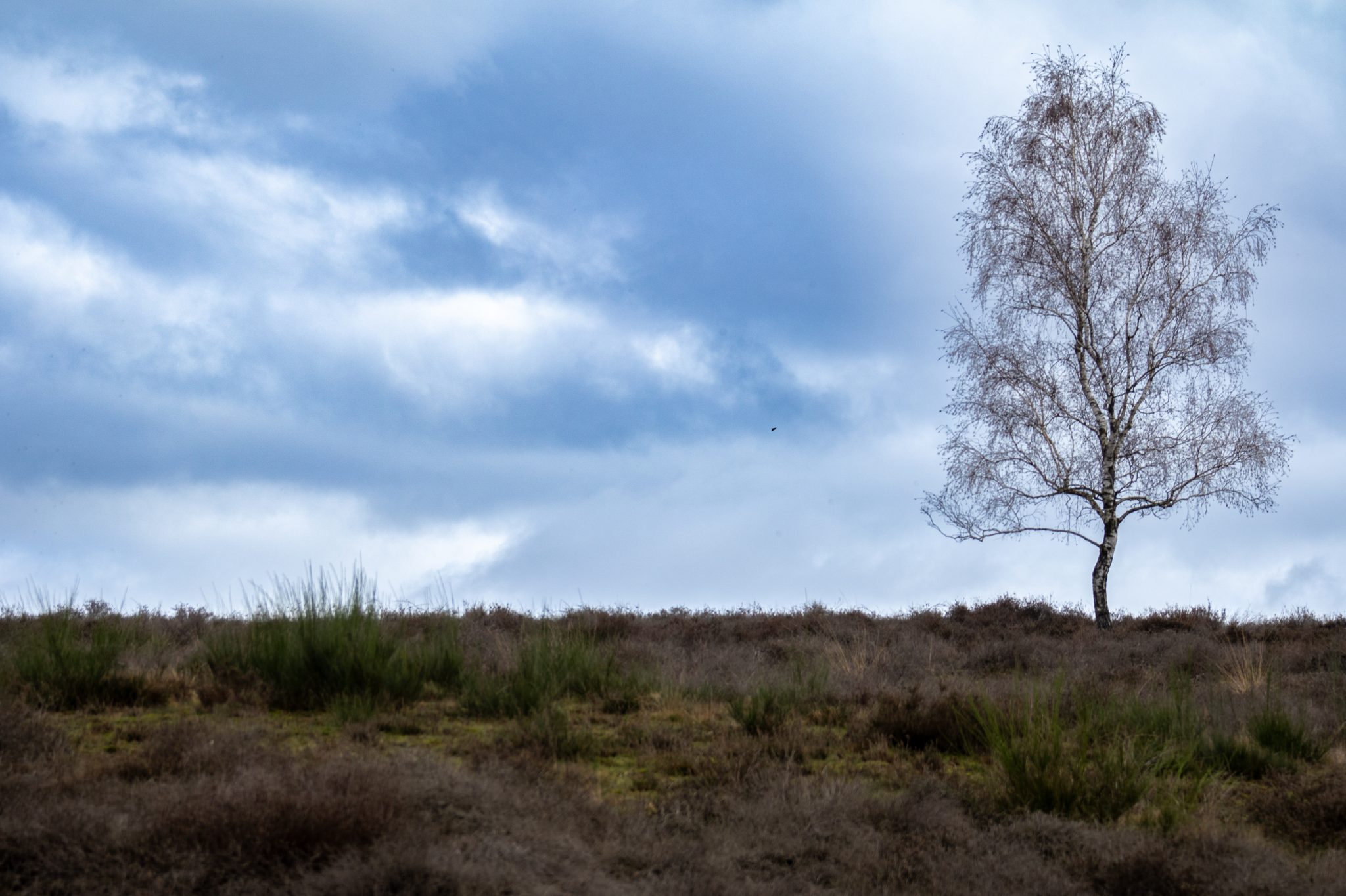 Alternative Text: A lonely tree on the heath, with a blue, cloudy sky.