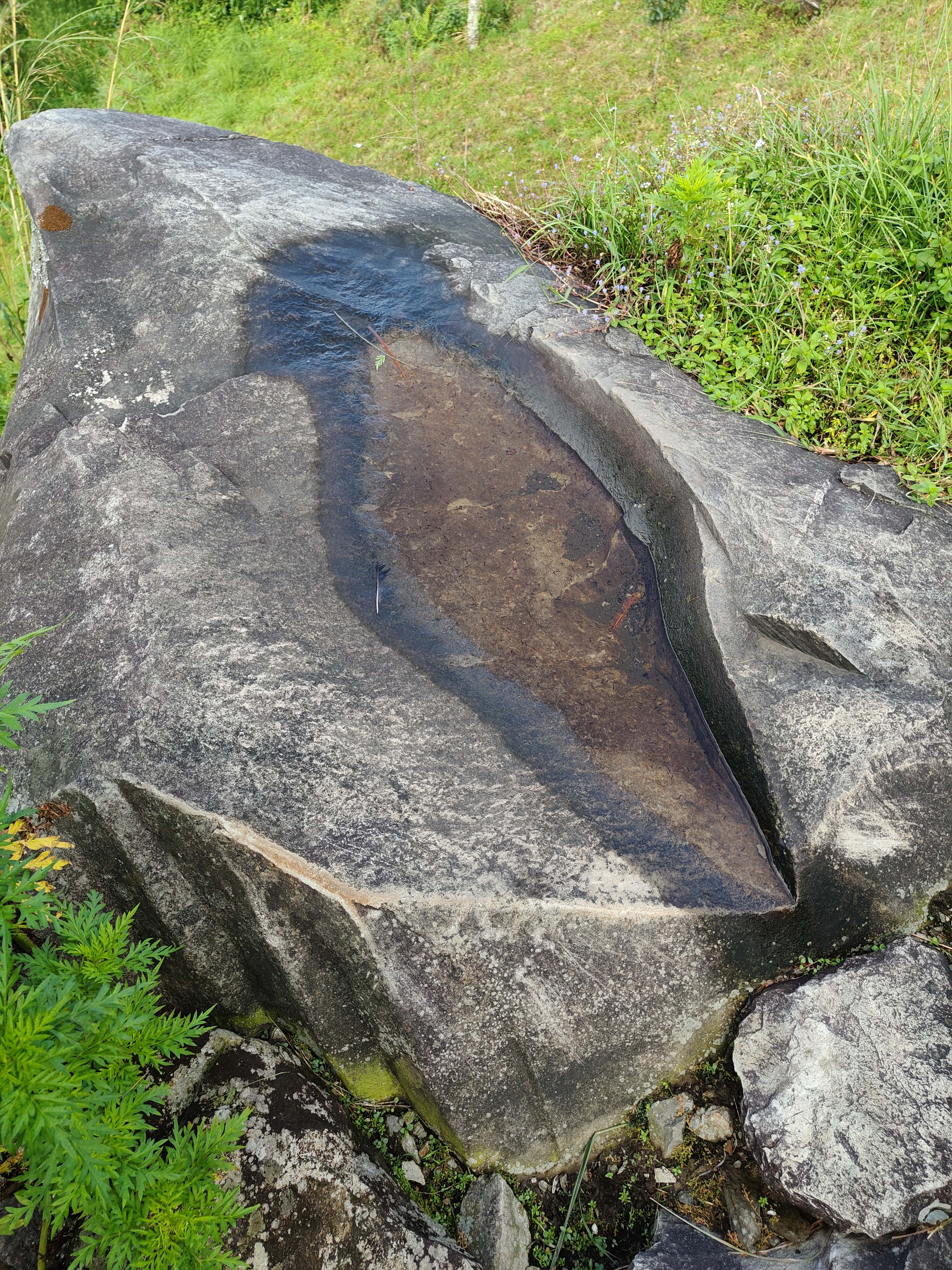 Alternative Text: A close-up view of a large, flat rock with a natural depression filled with water.