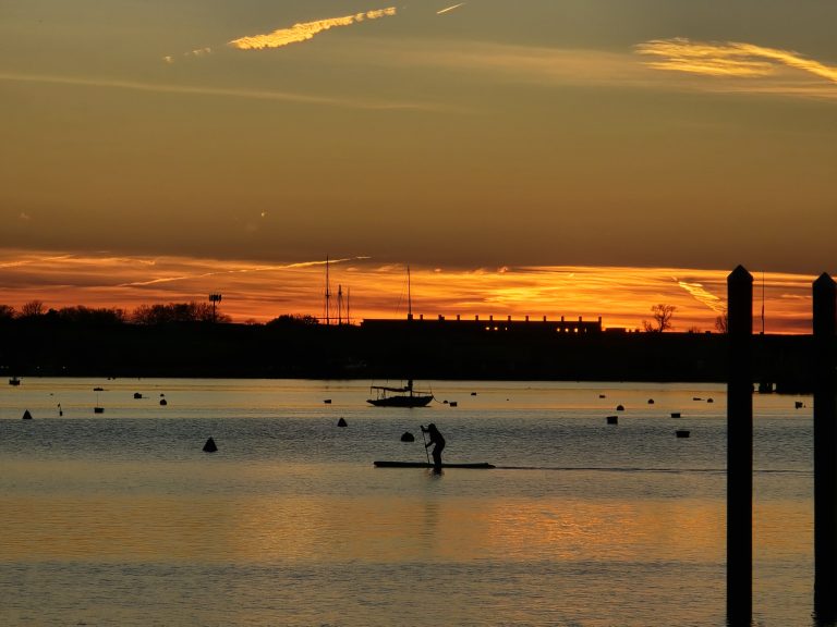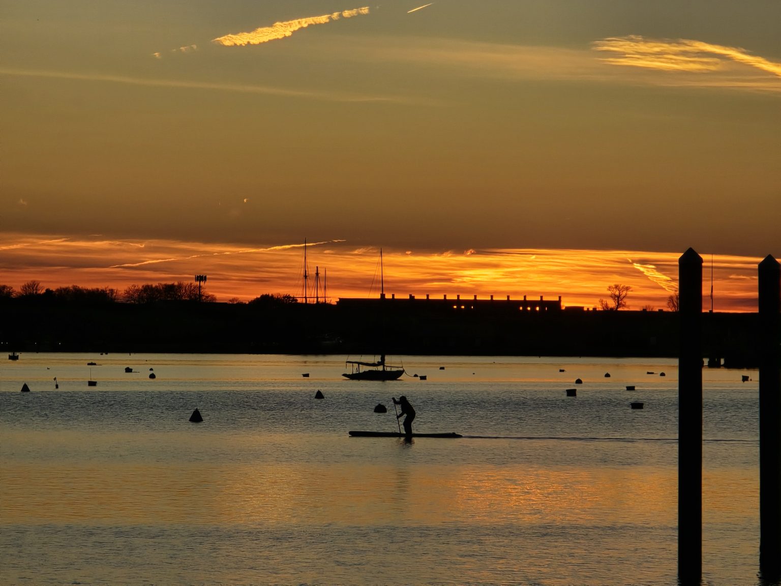 Alternative Text: A silhouetted paddleboarder glides across calm water at sunset under vibrant orange and yellow skies in Newport, Rhode Island.