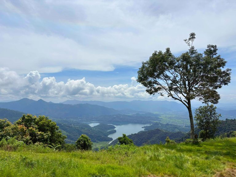 Alternative Text: A panoramic view of a lush landscape featuring rolling mountains and a serene lake.
