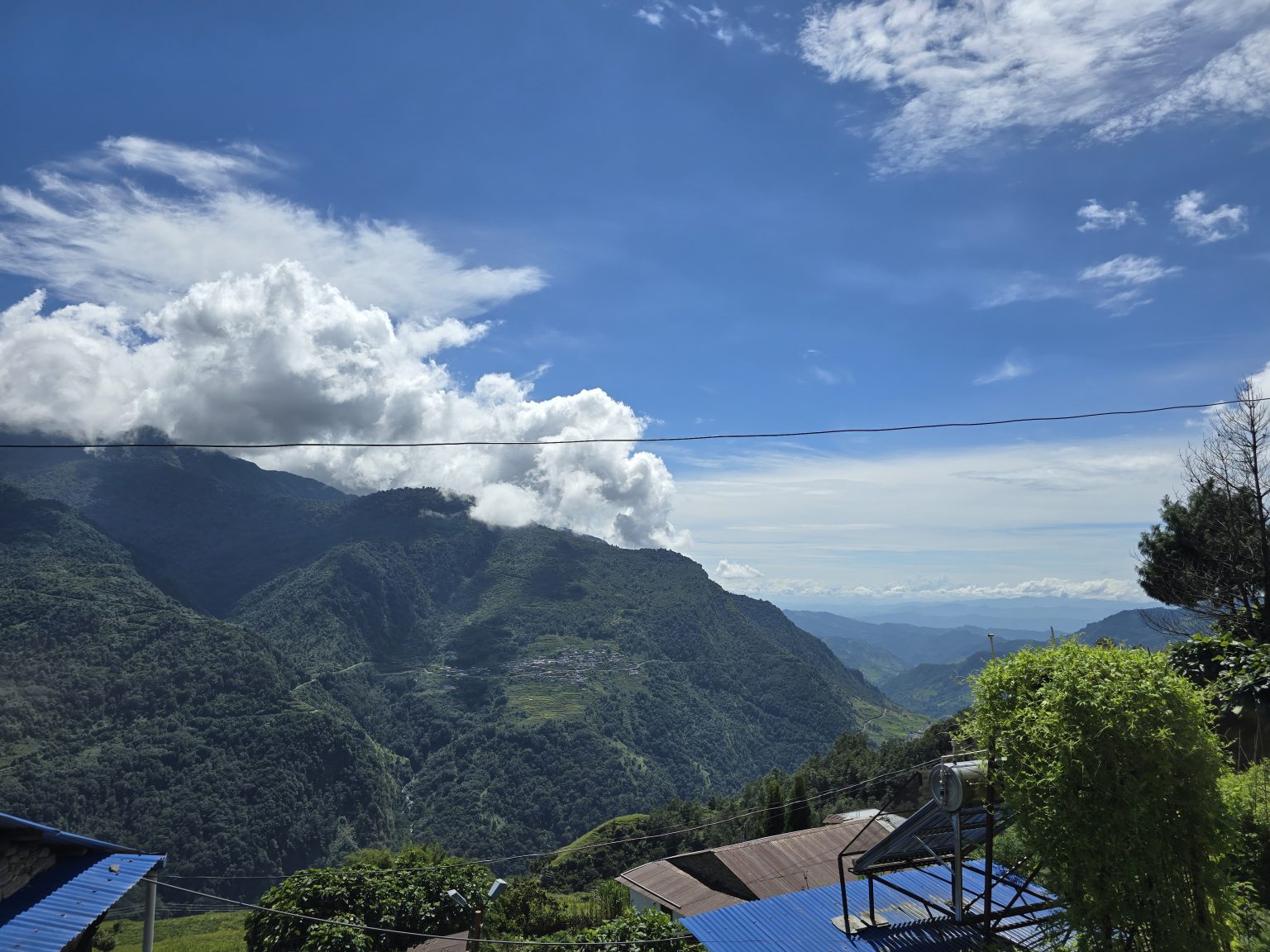 Alternative Text: A panoramic view of a lush green mountainous landscape under a clear blue sky, dotted with fluffy white clouds.