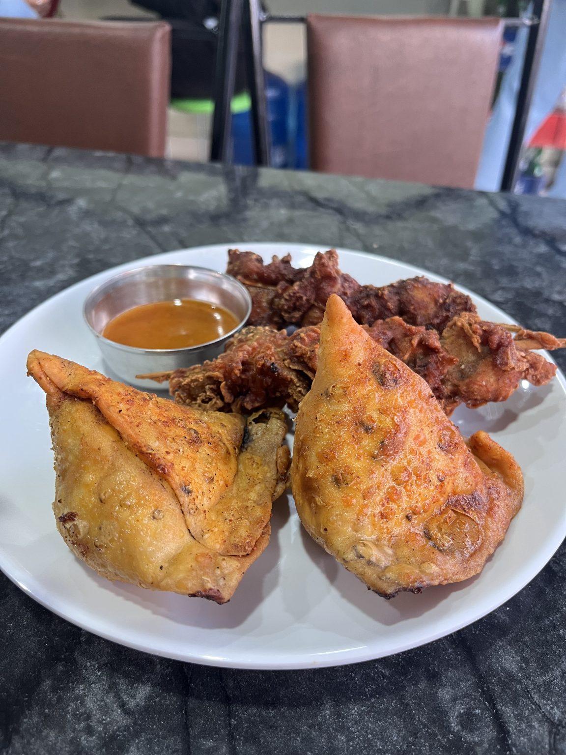 Alternative Text: A white plate is served on a dark marble surface, featuring two golden-brown samosas with a crispy texture on the left and a portion of deep-fried chicken pieces on the right.
