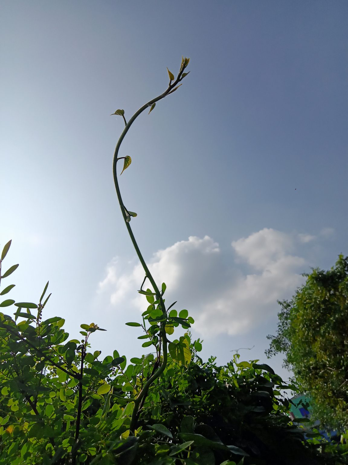 Alternative Text: A tall, slender plant vine stretches upwards against a clear blue sky, adorned with small green leaves near the top.