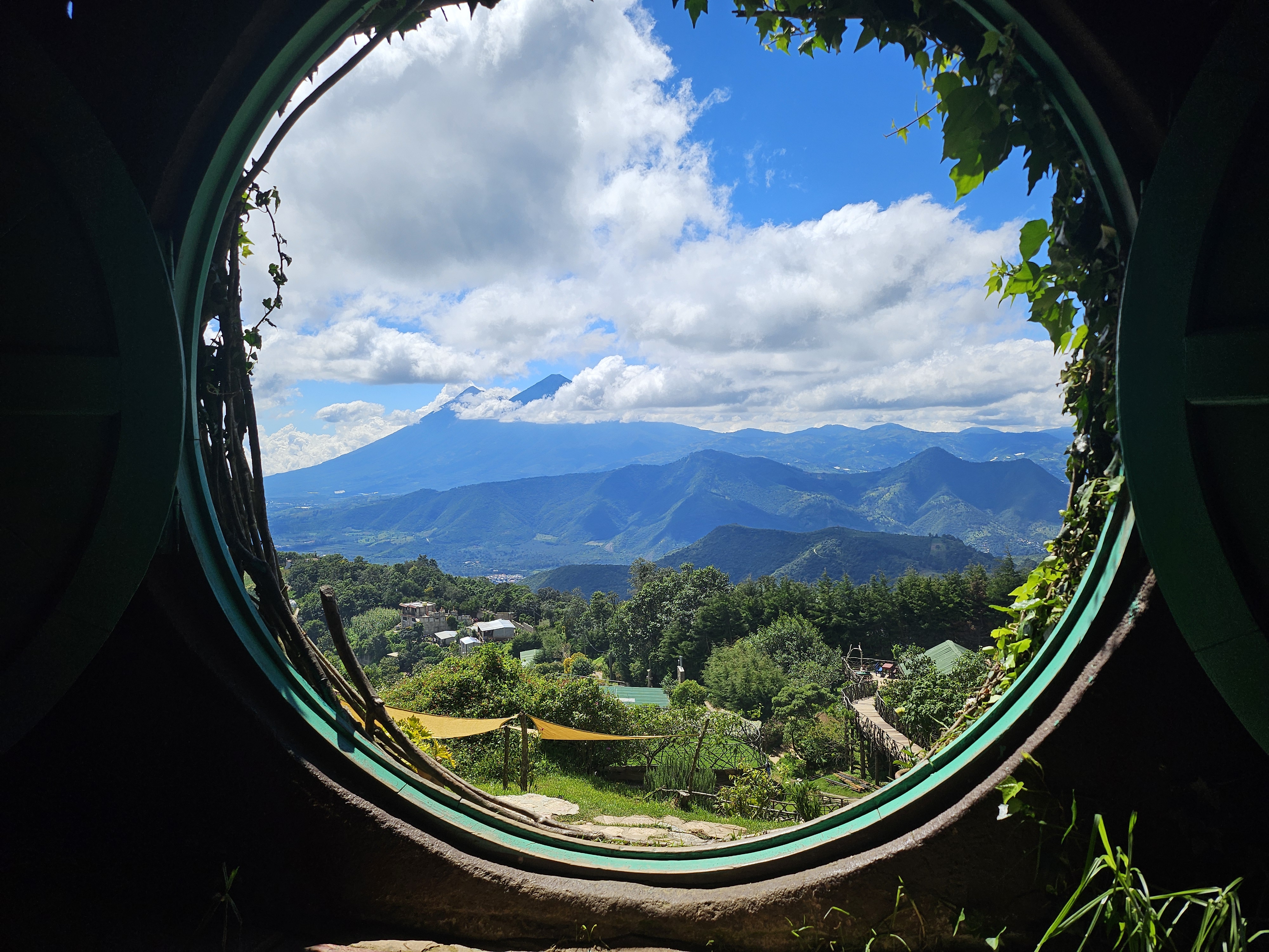 Alternative Text: A circular window framed by greenery reveals rolling hills and mountains beneath a partly cloudy sky, blending nature and rustic charm.