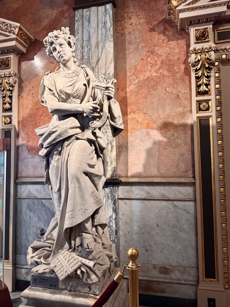 Alternative Text: A sculpture of a woman playing a harp inside the National Theatre of Costa Rica, featuring detailed craftsmanship and a classic design.