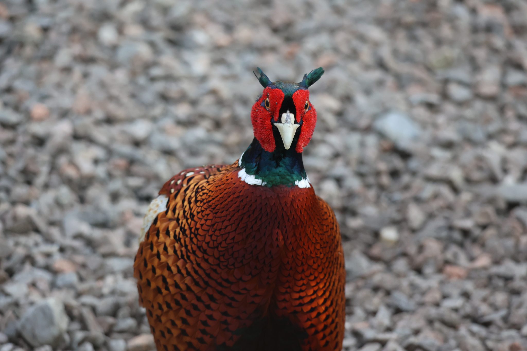 Alternative Text: A close-up of a colorful Male pheasant with vibrant red, green, and brown feathers, standing on a bed of small stones.