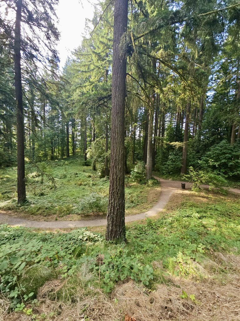 Alternative Text: A curved trail winds through tall pine trees in Hoyt Arboretum, Washington Park, Portland. Sunlight filters through the trees, creating a calm forest atmosphere.