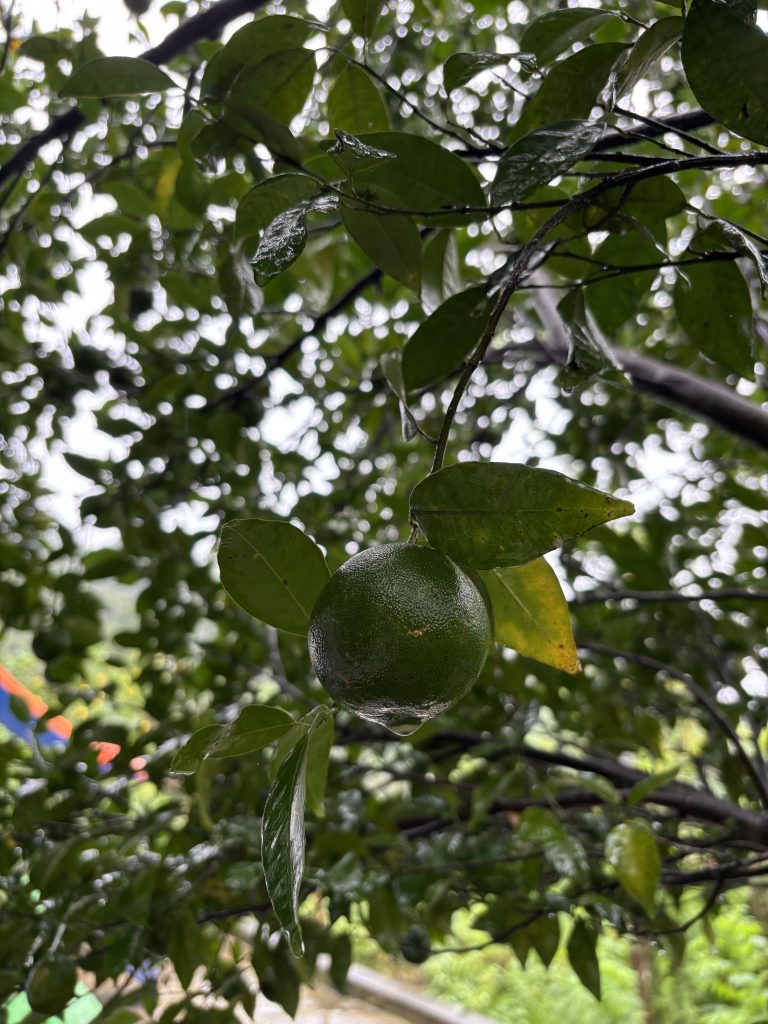 Alternative Text: A close-up view of a green Orange fruit hanging from a branch, surrounded by lush green leaves.