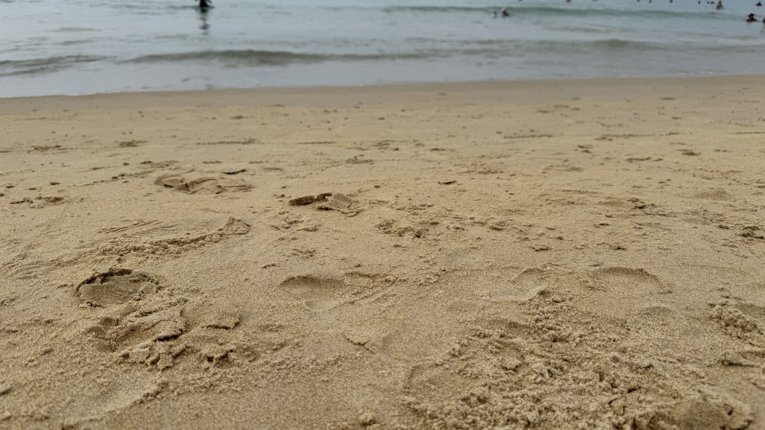 Alternative Text: A low-angle perspective across a sandy shoreline with footprints leading toward gentle ocean waves in the distance.