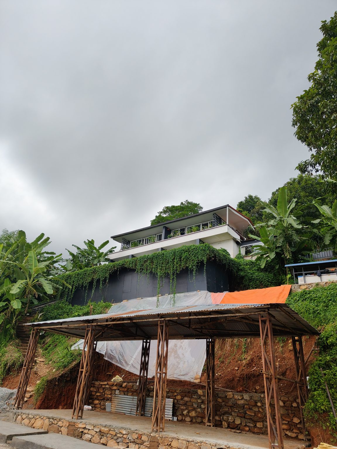 Alternative Text: A hillside view of a multi-story house partially covered in greenery, with large windows and a balcony.