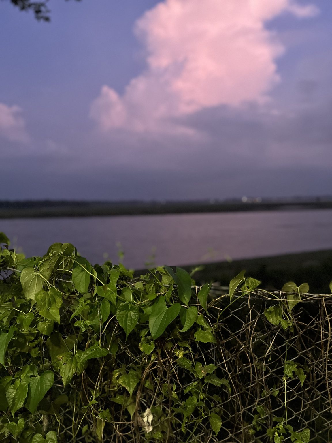 Alternative Text: A lush green vine with various leaves grows along a chain-link fence in the foreground, while the background features a serene body of water reflecting purple and pink hues of a cloudy sky at dusk.