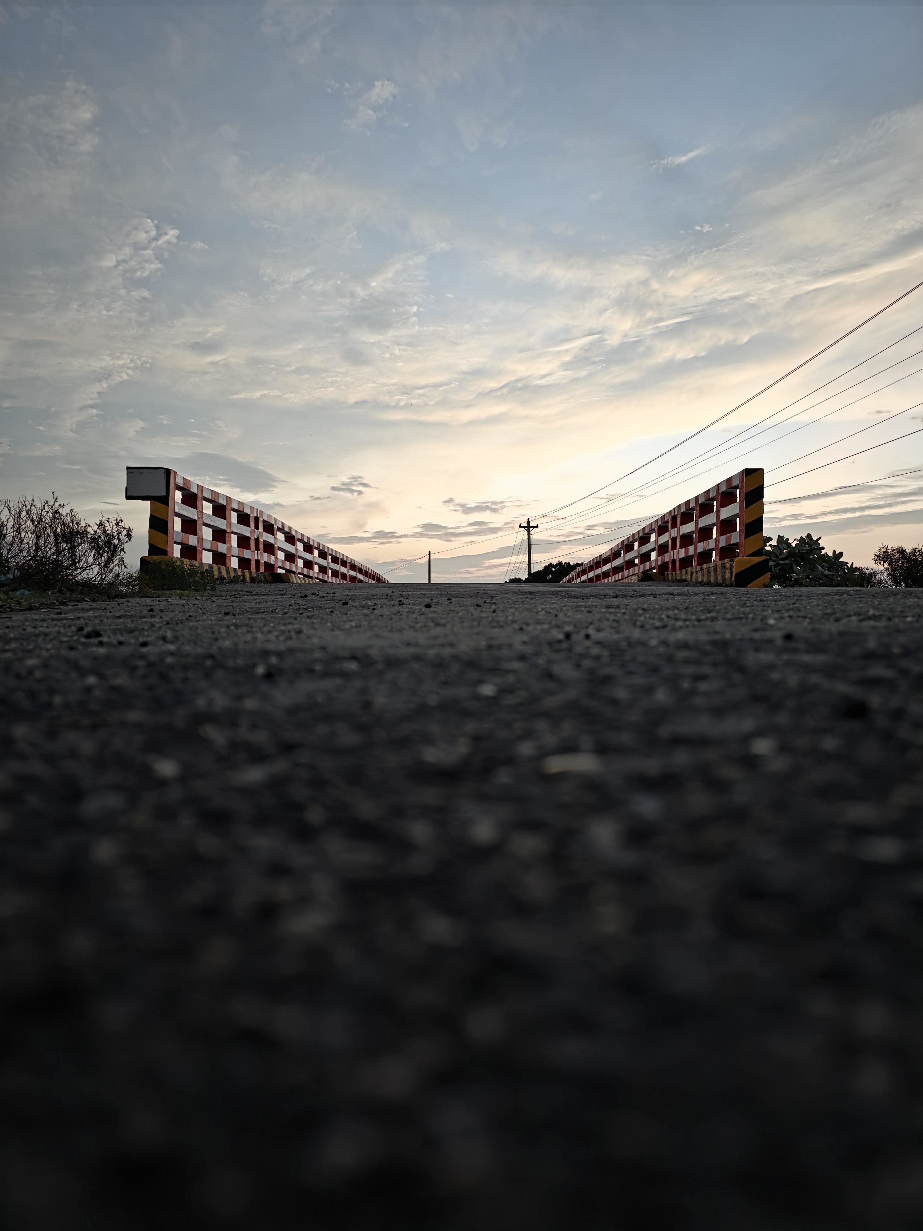 Alternative Text: A close-up shot of an asphalt road, taken from ground level and looking straight through a small bridge. The photo was taken at sunset, with white clouds in the sky reflecting the sunlight.
