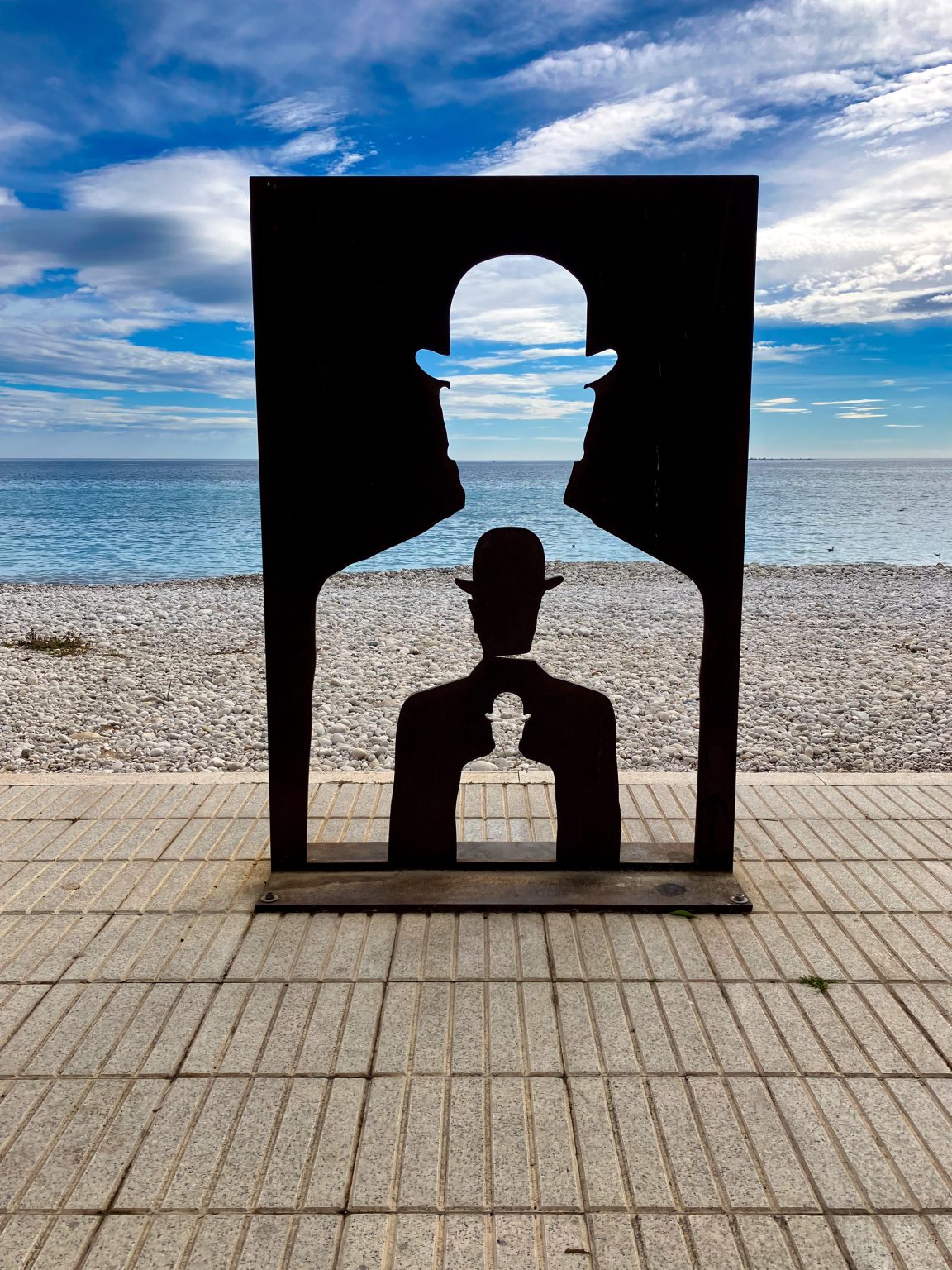 Alternative Text: A glimpse of ‘Man with Bowler Hat’ towards the Mediterranean Sea in Altea, Spain.