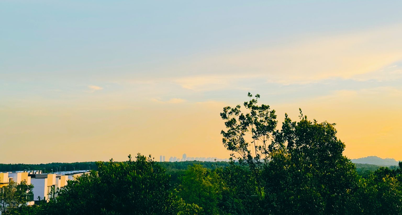 Alternative Text: A panoramic view of a landscape during sunset, featuring lush greenery in the foreground, with trees and shrubs surrounding a cluster of modern white buildings. In the background, a city skyline is faintly visible against a pastel-colored sky that transitions from blue to warm tones of orange and yellow.