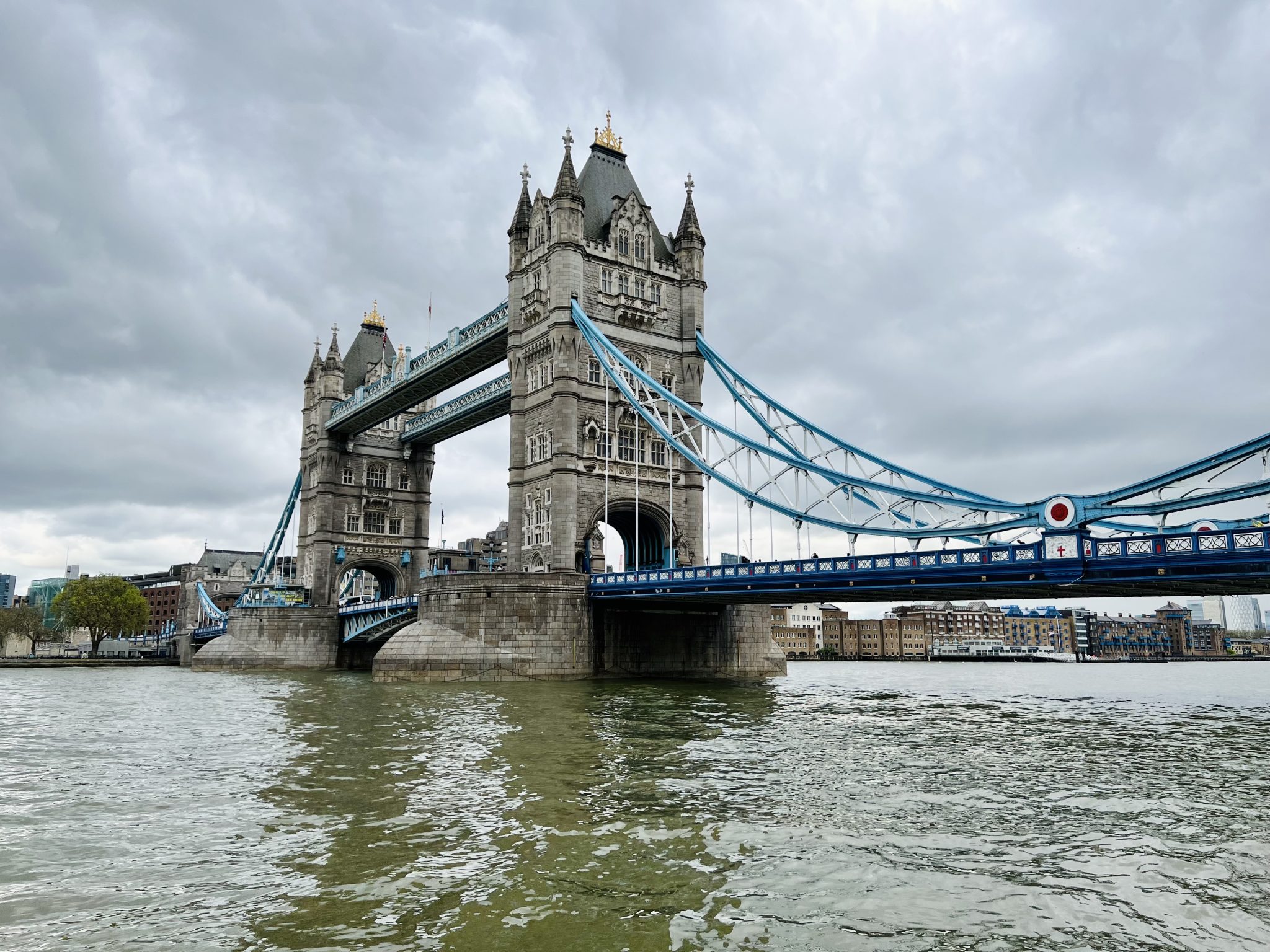 Alternative Text: The Tower Bridge in London, with its two towers and suspension ropes, spanning a wide river under a cloudy sky.
