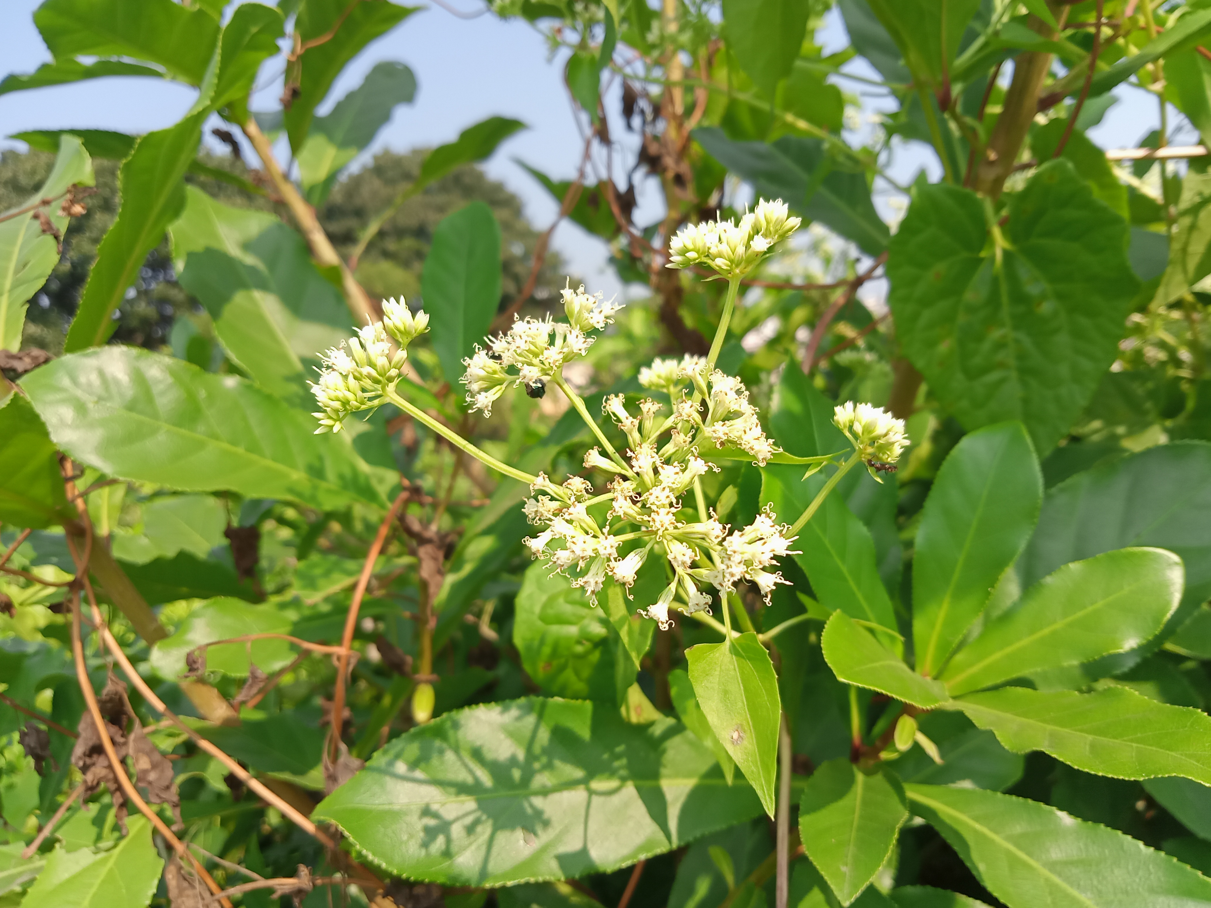 Alternative Text: A cluster of small white flowers surrounded by green leaves. The background features various shades of green foliage, with some leaves showing a glossy texture and others slightly wilted.