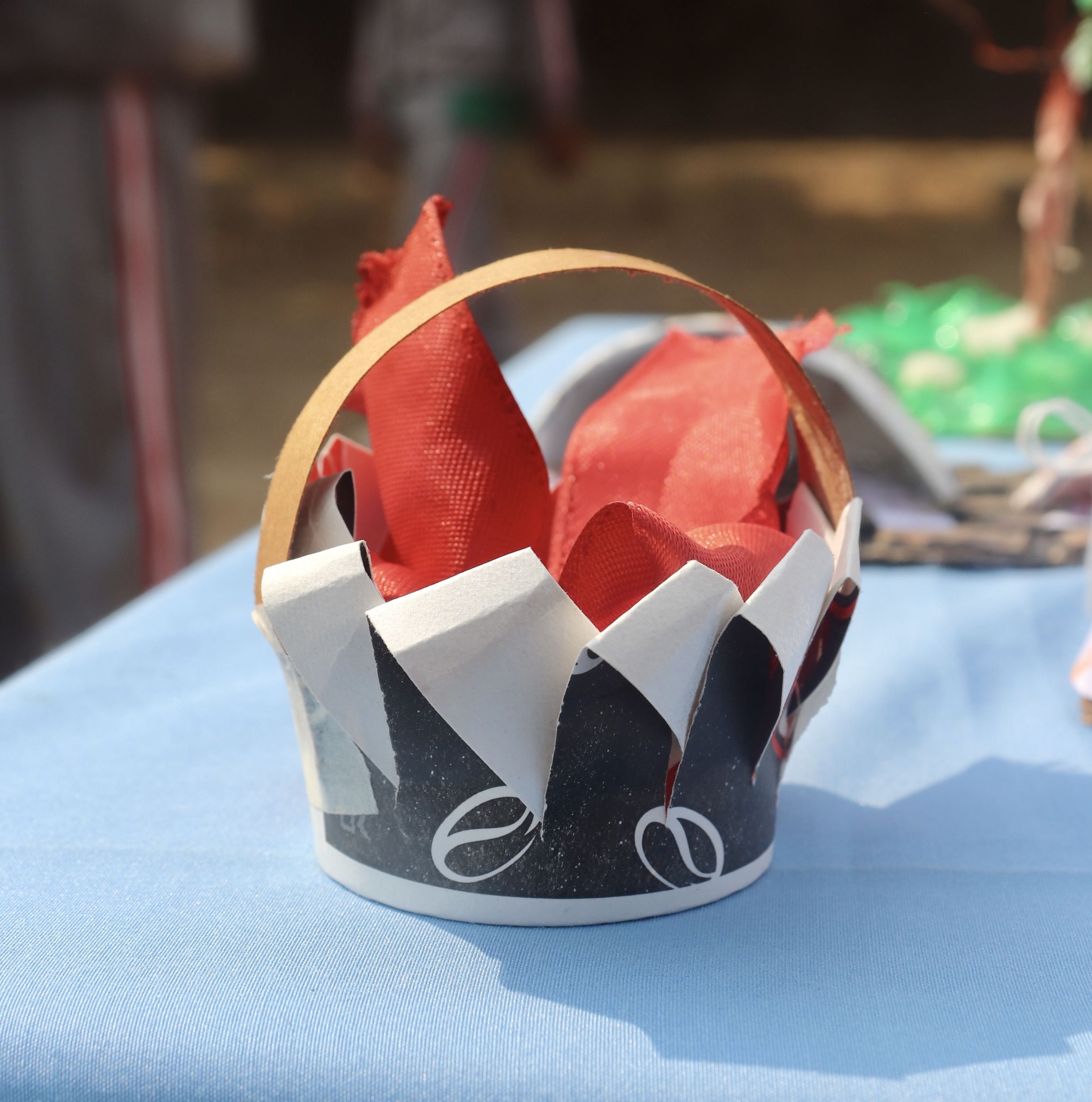 Alternative Text: A handmade paper crown displayed on a blue tablecloth, featuring a black base with white accents and red fabric strips emerging from the top.