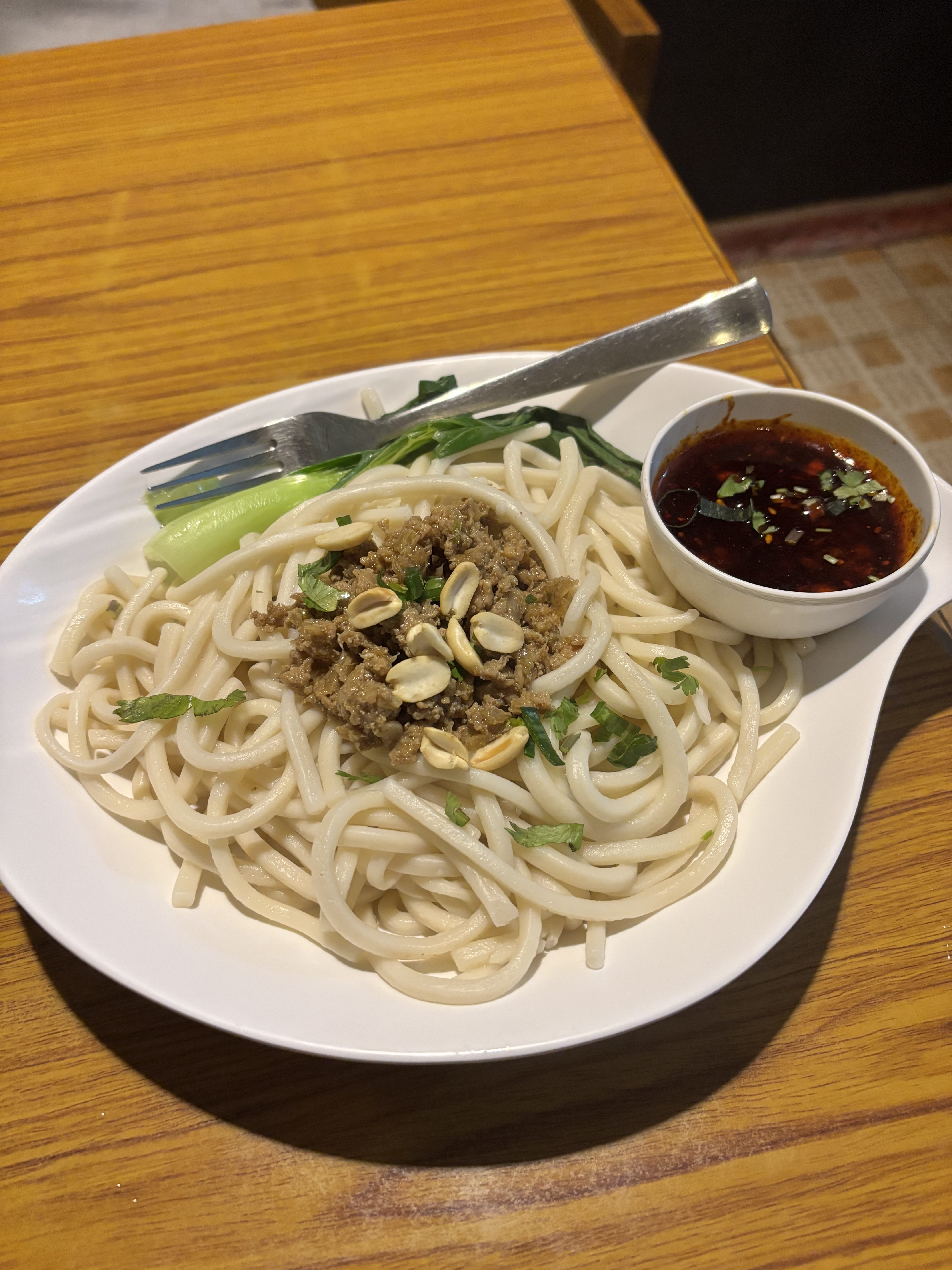Alternative Text: A plate of keema noodles topped with savory meat and rich sauce, garnished for an appetizing presentation.