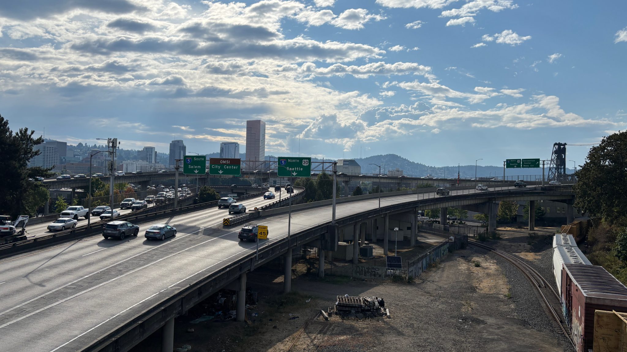 Alternative Text: In the distance is the skyline of Portland, Oregon. In the foreground are several elevated highways. On the right is a train.