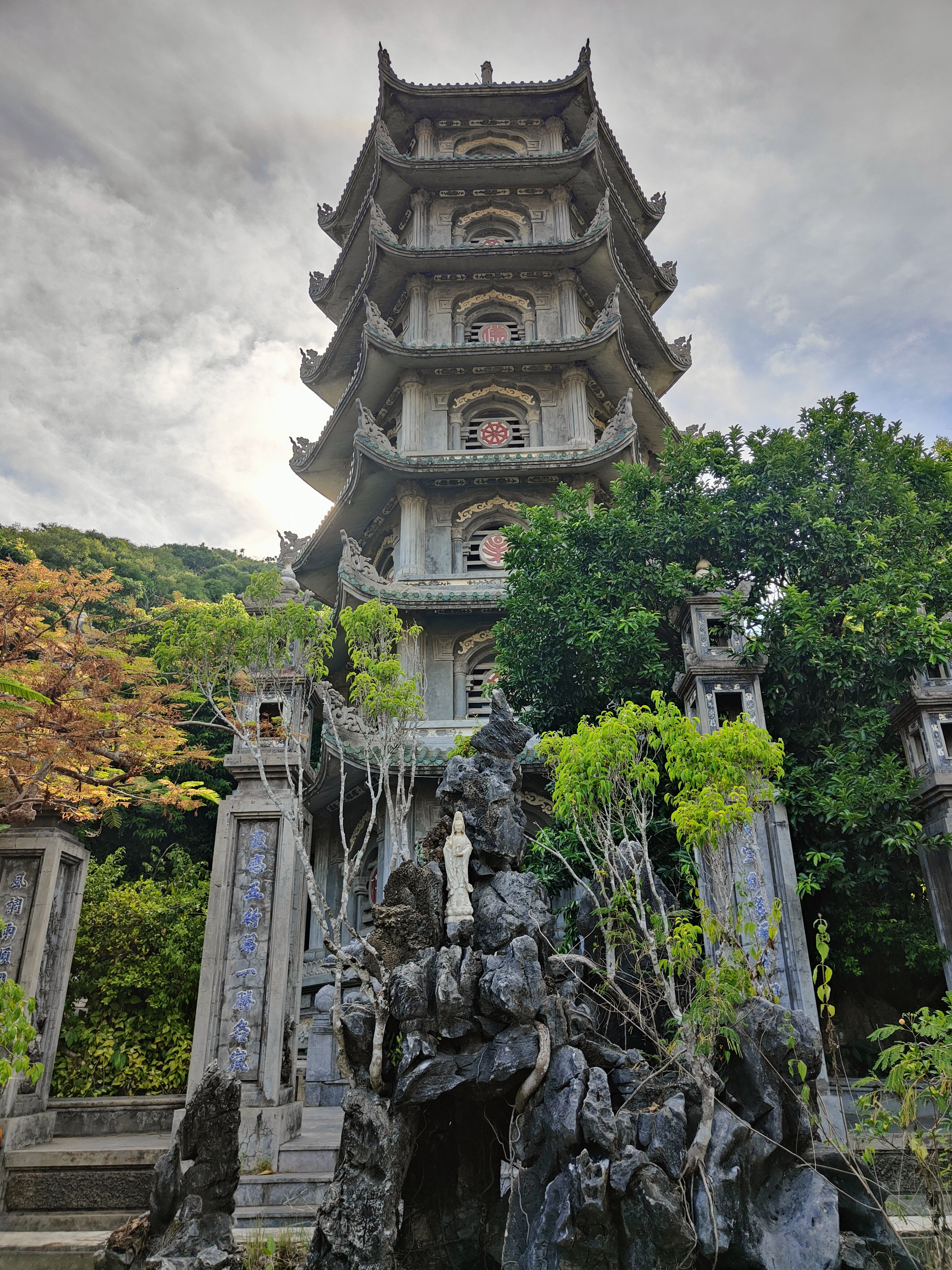 Alternative Text: A tall stone pagoda at the Marble Mountains in Da Nang, Vietnam, surrounded by green trees. At the base, a small white Buddha statue is placed on rocky formations in front of the entrance.