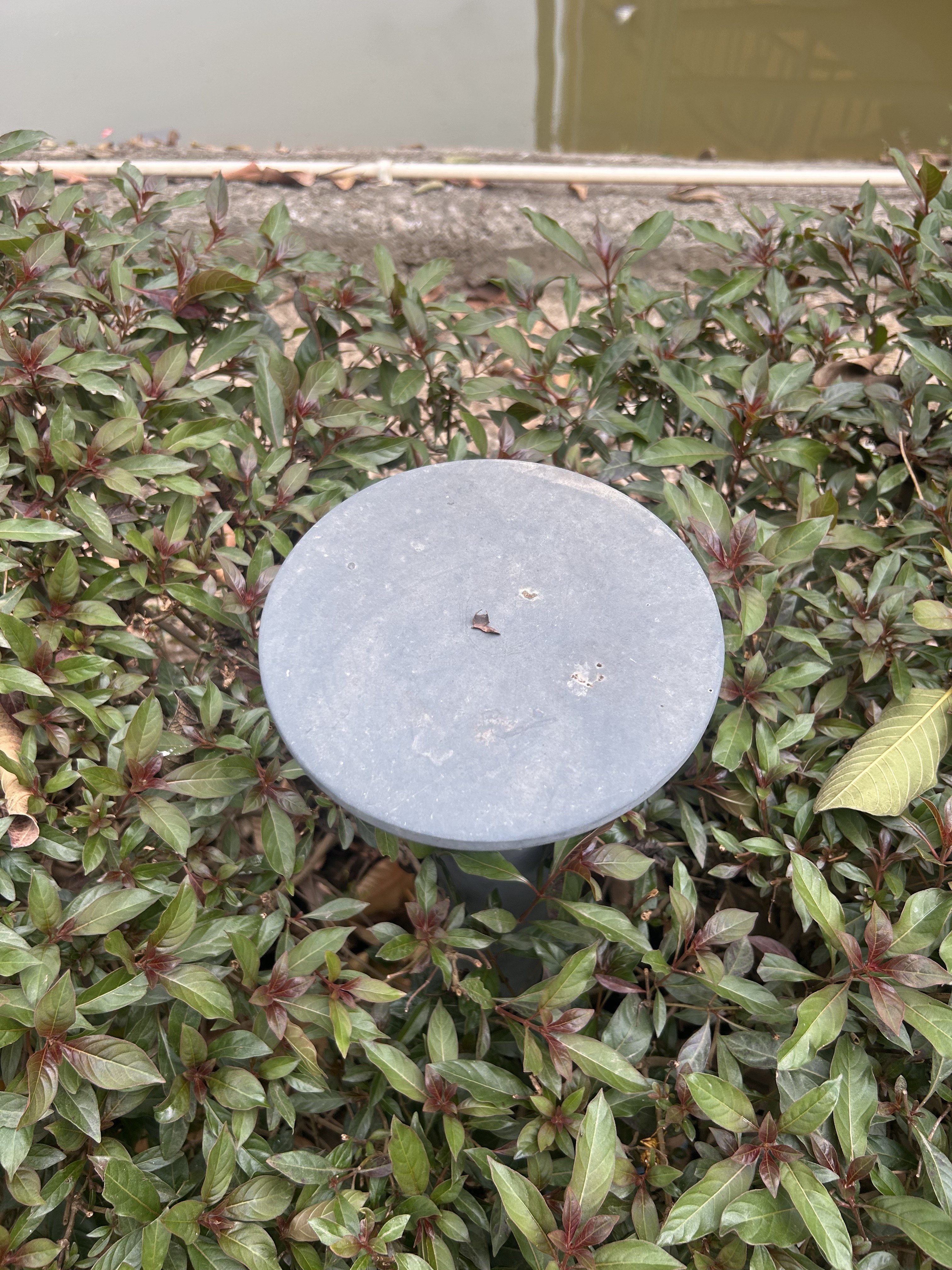 Alternative Text: A round, gray metal post surrounded by dense green foliage, with a body of water visible in the background.