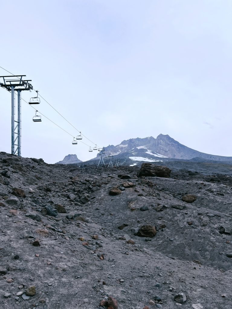 Alternative Text: Ski lifts going towards a mountain with volcanic rock ground visible at the bottom