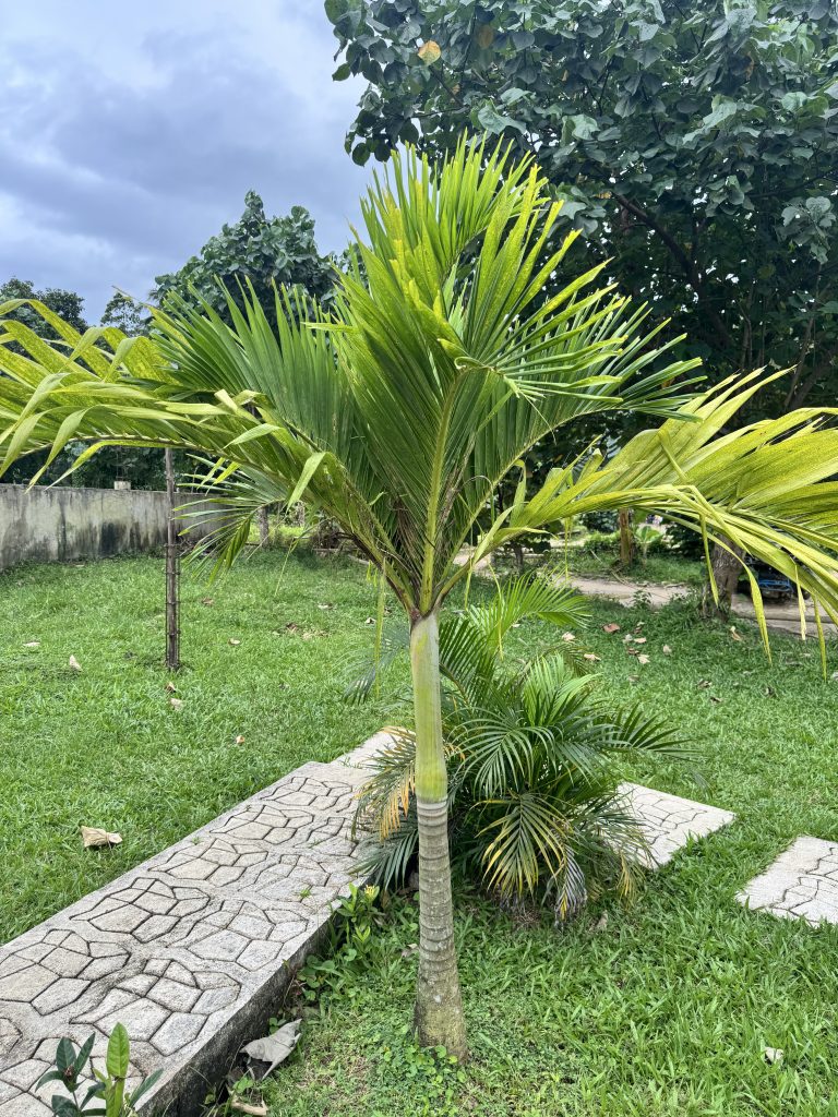 Alternative Text: A vibrant palm tree stands prominently in a green garden, surrounded by lush grass.