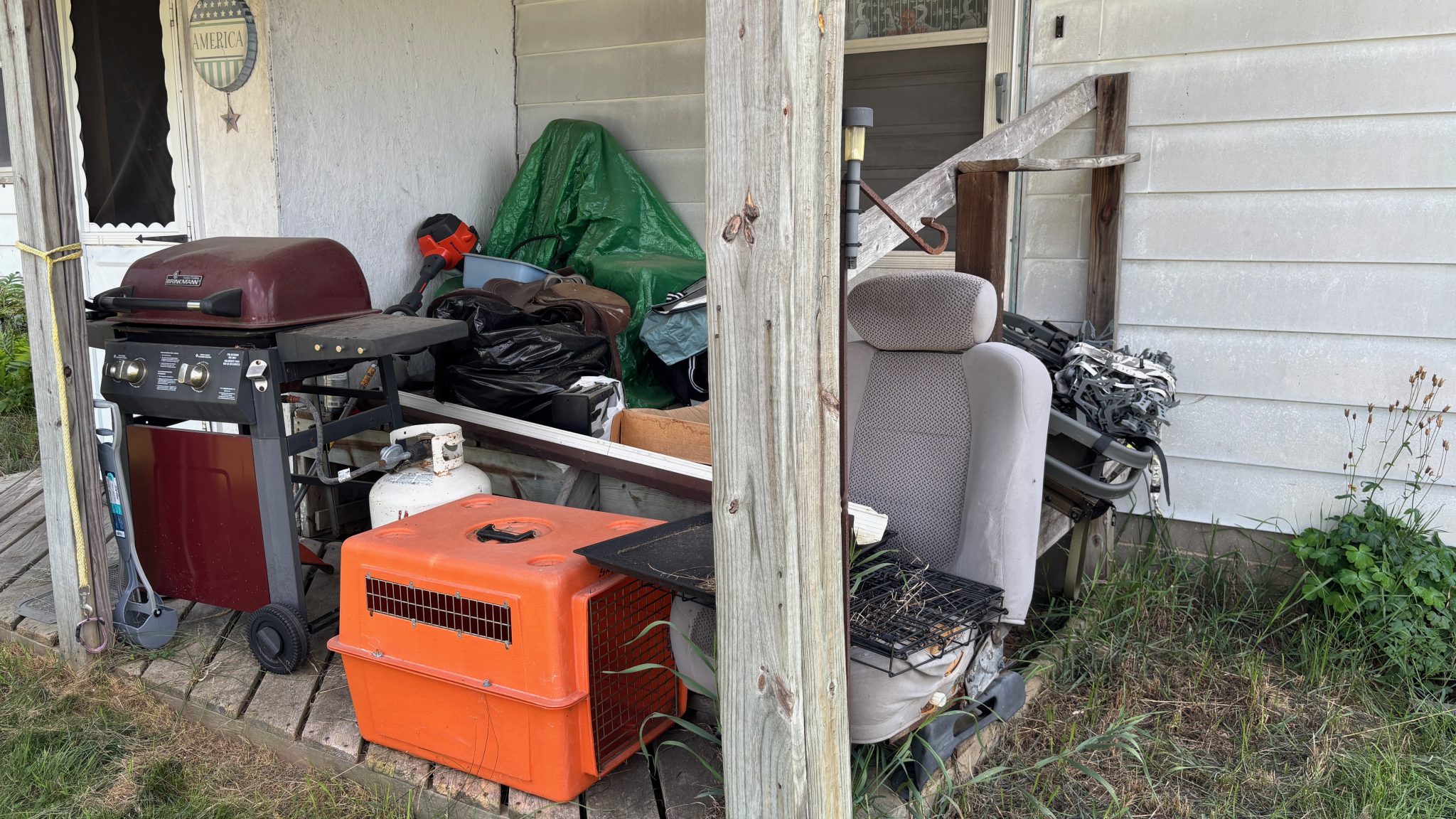 Alternative Text: On a small porch, a grill, a chair from a car, a dog coop, and some other things.