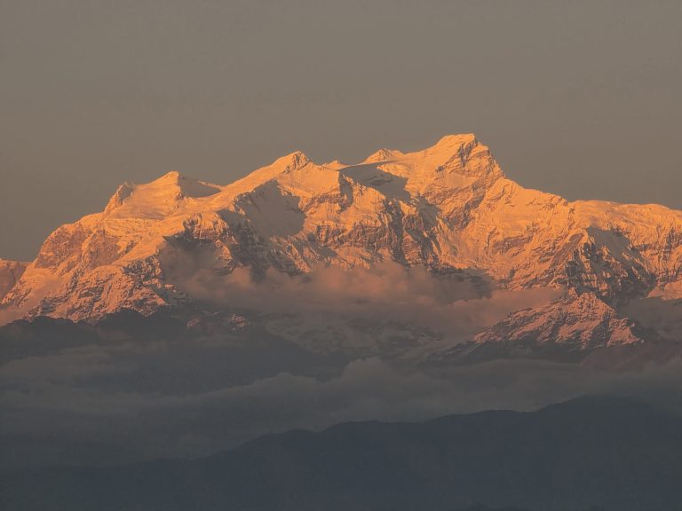 Alternative Text: A stunning view of snow-capped mountains at sunset, with the peaks illuminated in a warm, golden light.